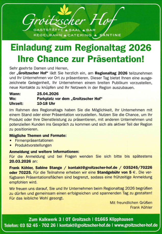 Wir sind eine traditionelle Landgaststätte, welche über eine Kantine sowie viele verschiedene Räumlichkeiten für Ihre Veranstaltung verfügt. Gern richten wir Ihre Veranstaltung aus, ob bei uns im Haus oder bei Ihnen als Catering. Unsere Öffnungszeiten richten sich nach Ihrer Veranstaltung. Nehmen Sie Kontakt mit uns auf.